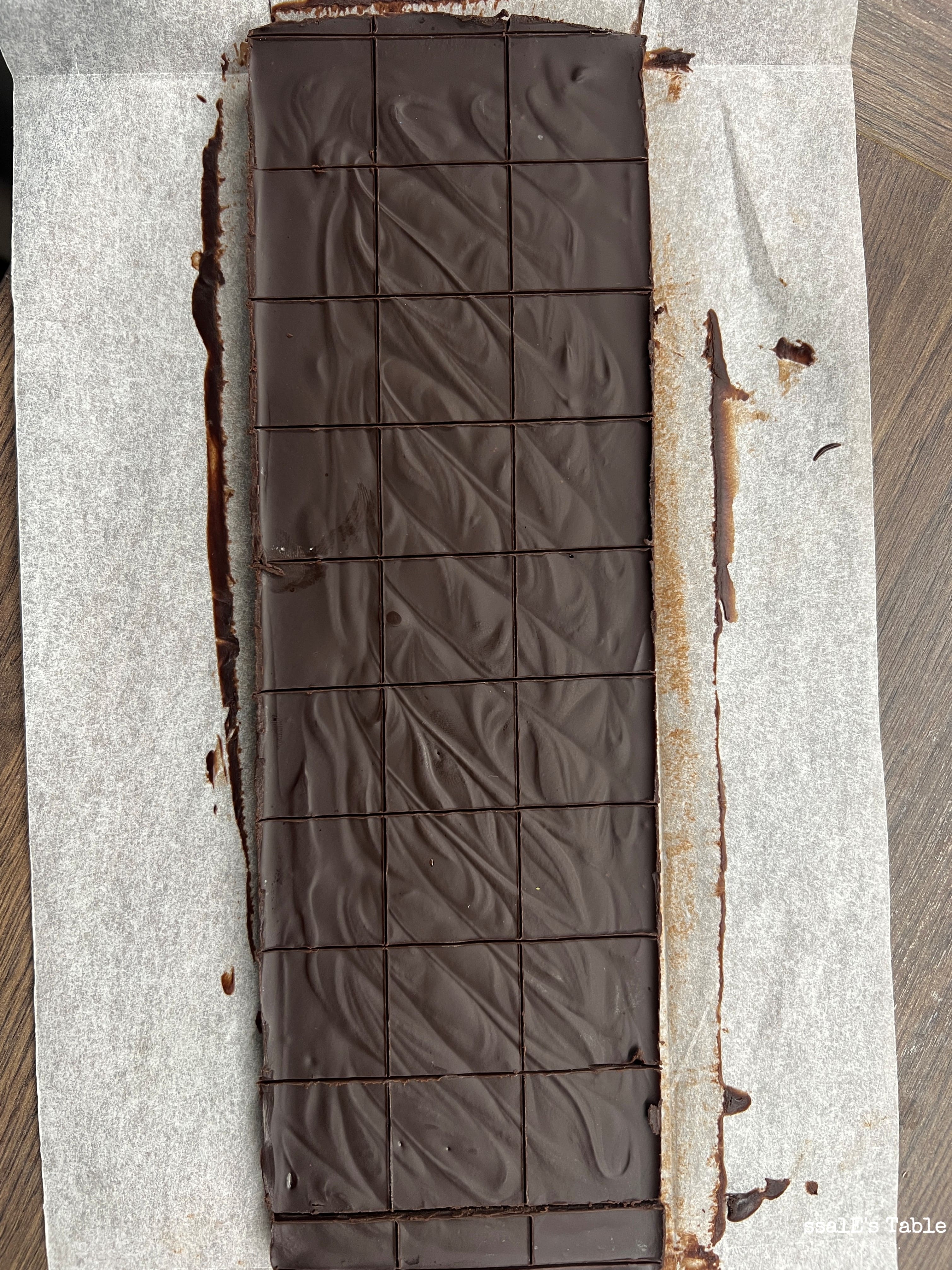 잘 굳은 초콜릿을 틀에서 꺼내 종이 호일을 벗겨주세요. 15x15는 3cm의 정사각형으로 자르시면 됩니다. 저는 15x15 틀이 없어서 27x8.5틀을 사용해서,2.8cm 정사각형 모양으로 잘랐어요. 칼을 따뜻한 물에 데워 닦은 뒤 자르면 단면이 아주 깔끔하게 잘려요. 그리고 큰 칼이 아닌 작은 칼의 칼날 끝부분을 이용해서 콕콕 자르시면 훨씬 단면이 잘 잘려요. 파베는 칼날에 닿을수록 손실이 많아서 여러 번 해보니 저는 저 방법이 제일 좋았어요. 마지막으로 코코아 파우더가 담긴 봉투나 그릇에 초콜릿을 넣고 고루 묻혀주면 완성입니다! 마지막에 파우더를 묻히면서 손으로 모양을 다듬어 주세요. 그럼 훨씬 예쁘게 모양이 잡힌답니다.